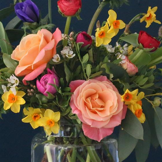 A beautiful spring selection of flowers in a glass vase.