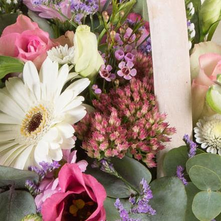 A pastel collection of dainty blooms in pinks, whites and lilacs, including roses, sedum, limonium, wax flower and lisianthus.