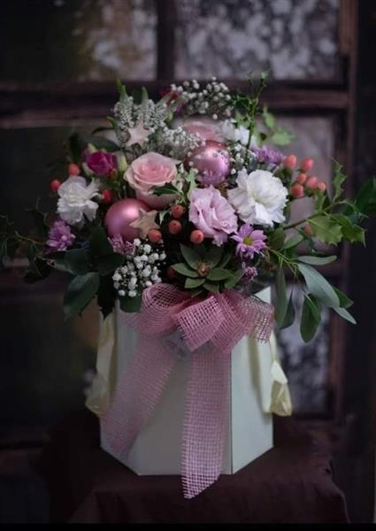 Stylish hatbox filled to the brim with festive foliage and flowers