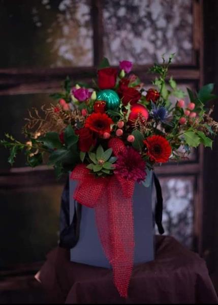 A stylish hatbox filled to th ebrim with festive foliage and flowers