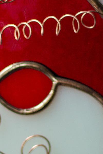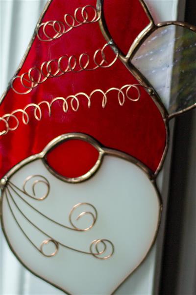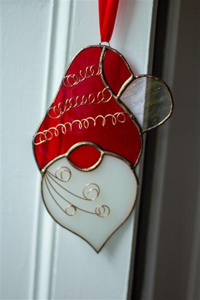 This santa will happily hang in the window and changes colour with the light. Tiffany style glass with copper wire overlay details