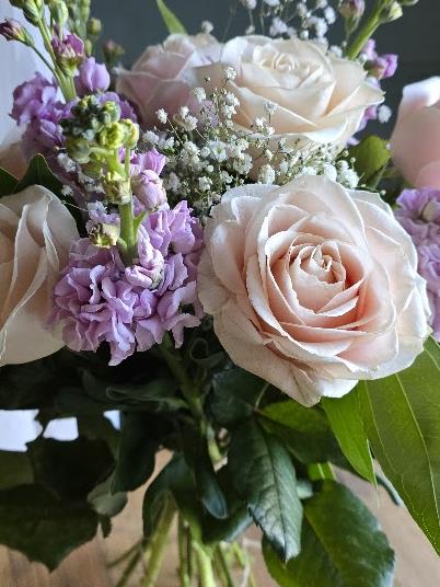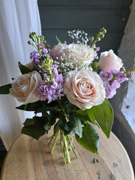 A gorgeous bouquet of sweet avalanche roses and scented stock with gypsophila and greenery. Hand tied ready for a vase.