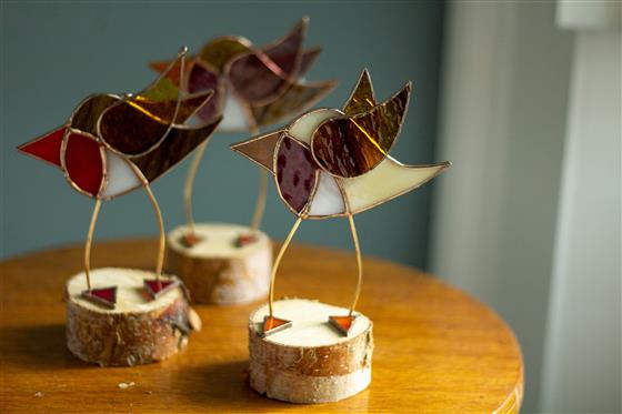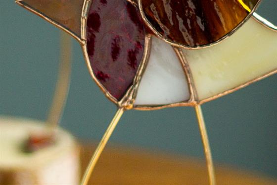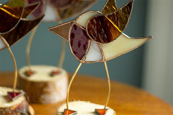 The standing robin.Handmade glass robin displayed on wooden stand. Beautiful to admire in the evening light