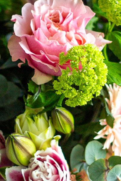 A romantic bouquet of blush pinks, deeper pinks and a variety of greenery.